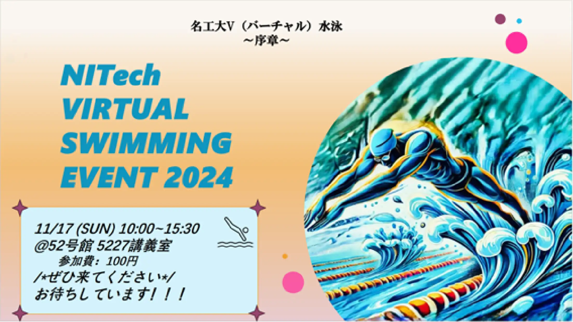 名古屋工業大学水泳部です。初めての出展でドキドキのワクワクです。V(バーチャル)とありますが、今年度はVR厳しいので来年に乞うご期待という意を込めて序章にしてあります。ぜひお立ち寄りください。