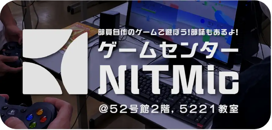 NITMic (にとみく) ゲームセンターでは、部員が制作したゲームを実際に遊んで体験できます! 今年もNITMic部誌 ”Archives” を頒布します! (C0deとの共同執筆! ) 是非遊びに来てね!